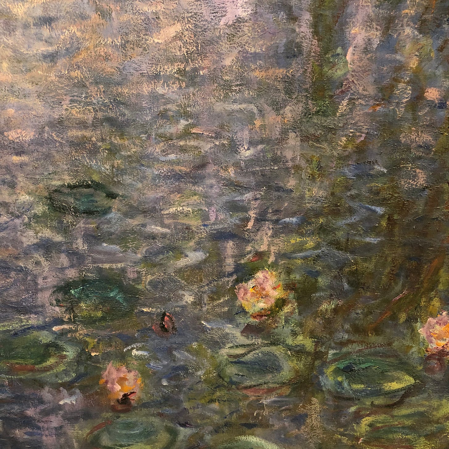 It moves the spirit to see them. In their pastel shades, purple, pink, green, blue, the world blends in this snapshot of nature’s eternity. A moment in time, what is now famous was misunderstood upon release. People were perplexed that Monet chose this subject matter. Everything he could have filled these large canvases with and he chose the flowers floating in his garden at Giverny.